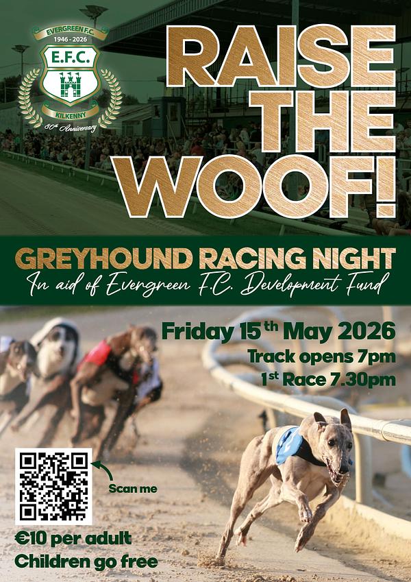 This May 15th we are hosting a fundraising event at Kilkenny Greyhound Stadium. We are Pawsitive that this is going to be a sensational nights entertainment, with all proceeds going towards our development fund. We want to ensure a big crowd and a big atmosphere, so we can "raise the woof" on the stadium that night!